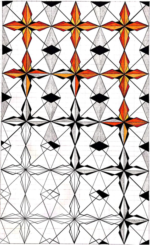 explores cultural heritage through geometric motifs, including diamonds, triangles, and lines, reflecting the simplicity and